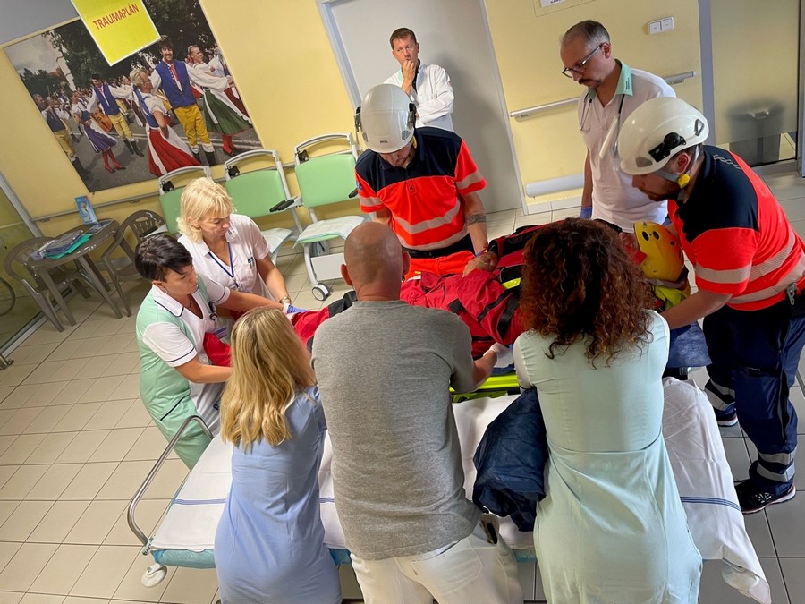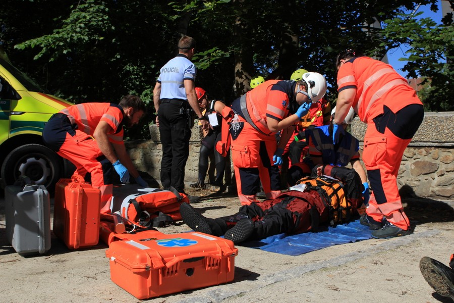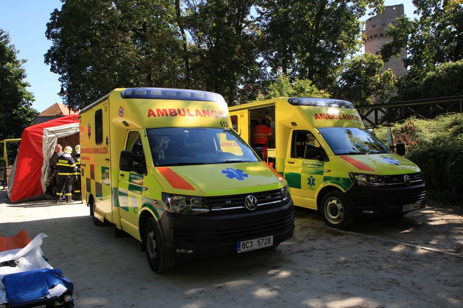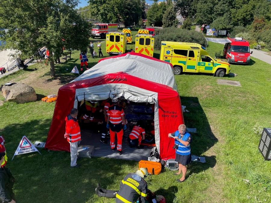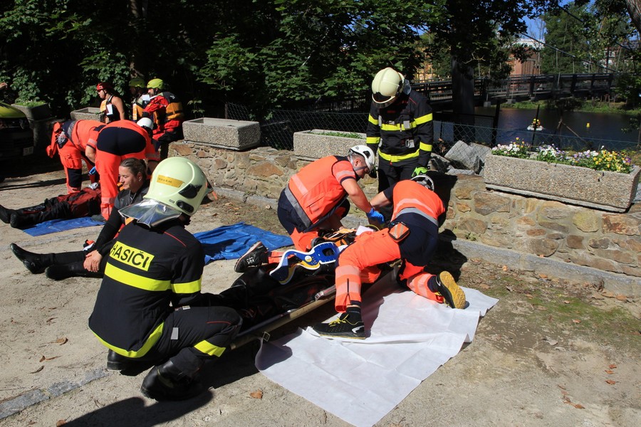 Zdravotnická záchranná služba JčK vyslala na cvičnou likvidaci mimořádné události celkem 10 posádek ze Strakonic, Písku, Prachatice a Tábora, včetně dvou vozů Iveco určených právě k takovým událostem. Navíc se cvičení zúčastnila také Zdravotnická záchranná služba Plzeňského kraje vysláním dvou posádek z Klatov. Tak jak to při podobných událostech bývá, záchranáři si od hasičů převzali všechny osoby vytažené z vody, roztřídili je dle závažnosti jejich stavu a zranění, poskytli jim profesionální přednemocniční neodkladnou péči v rozsahu dle podmínek a okolností na místě zásahu a následně je transportovali do nemocnice ve Strakonicích. V průběhu likvidace mimořádné události poskytovali krizoví interventi přímo na místě zasaženým obětem, přeživším a blízkým pozůstalým první psychickou pomoc a krizovou intervenci.