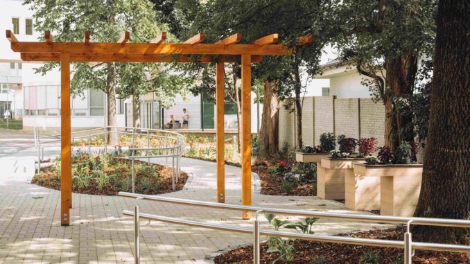 Terapeutická zahrada je také doplněna o vyvýšené záhony, díky kterým si pacienti mohou vyzkoušet novou možnost zahradničení a zároveň si zde rozvíjejí hrubou i jemnou motoriku a jiné smysly. Časem sem přibydou také lavičky ke krátkému odpočinku. Toto místo tak slouží jako prostor pro setkávání, relaxaci, nácvik pohybu, rozvoj motoriky i jiných smyslů.