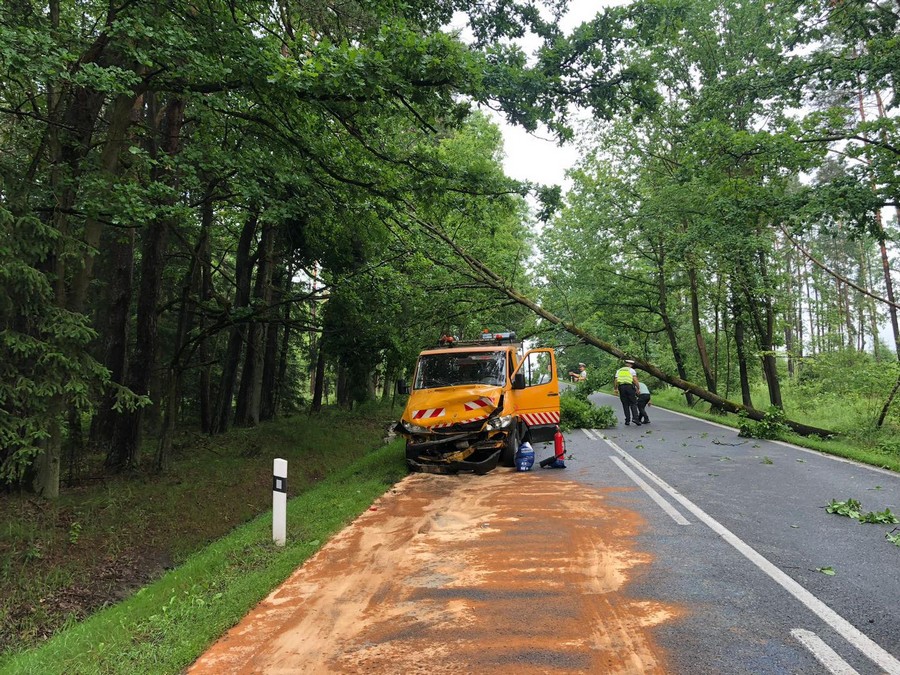 U Chýnova na Táborsku pak došlo po čtvrté hodině odpoledne k nehodě dodávky a osobního automobilu. „Přes silnici před řidičkou osobního automobilu spadl strom. Strom zůstal viset ve větvích a žádné z aut do něj nenarazilo. Doprava byla omezena do sedmi hodin večer. Nikdo nebyl zraněn. Hasiči použili sorbent k likvidaci úniku provozních kapalin,“ sdělila Matějů.