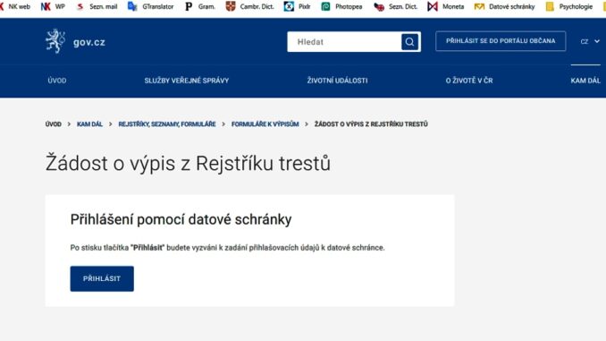 Pokud jste potřebovali výpis z Rejstříku trestů, bylo ještě donedávna nejjednodušší osobně navštívit některé z pracovišť Czech POINTu. Zaplatili jste správní poplatek 100 Kč, přičemž celá procedura trvala přibližně 30 minut. Tuto službu lze však získat, aniž byste museli někam chodit, a navíc zdarma. Podmínkou je využití vlastní datové schránky, což po nedávném velkoplošném zavádění schránek není pro mnoho lidí problém. Problémem je spíše to, že o této možnosti nevědí.
