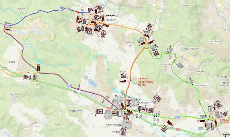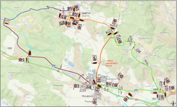 - úplnou jednosměrnou uzavírku silnice III/3844 ul. Stará dálnice – pravé strany v 1. etapě stavby a levé strany ve 2. etapě v úseku od kruhového objezdu Veselka v katastr. území Troubsko za odbočku Baltisbergrovy zatáčky ve směru na Kohoutovice v katastr. území Žebětín,
