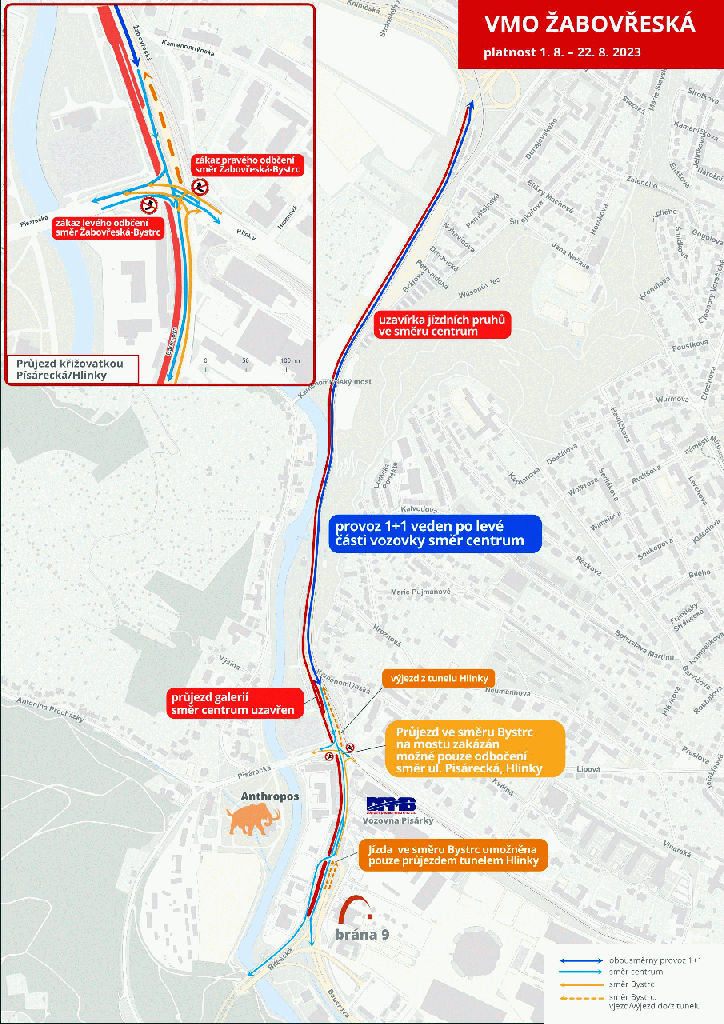 Od 1. do 22. srpna 2023 bude na Žabovřeské platit jiné uspořádání dopravy než doposud. Jízdní pruhy ve směru do centra blíž k řece budou uzavřené a auta projedou obousměrně v jízdním pruhu blíže k tramvajovému tunelu. Nájezd z ulice Fanderlíkovy na Žabovřeskou bude uzavřený. V křižovatce Pisárecká – Hlinky platí zákaz levého odbočení z ulice Pisárecké na Žabovřeskou a zákaz pravého odbočení z Hlinek na Žabovřeskou. Ve směru na Bystrc od Bauerovy budou muset řidiči jet tunelem Hlinky. Ve směru do centra bude uzavřený tunel Hlinky a trasa povede přes křižovatku Pisárecká – Hlinky. Bližší informace najdete v mapě níže.