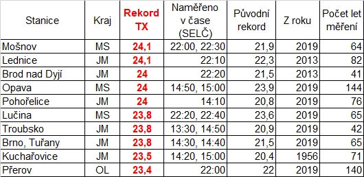 V Jihomoravském kraji padly v pátek 20. října teplotní rekordy na všech meteorologických stanicích. Rekordní maximum pro 20. říjen bylo překonáno nebo vyrovnáno téměř na pětině stanic měřících alespoň 30 let. Rekord pro přepsaly i stanice měřící více než 100 let. V Lednici a Strážnici meteorologové naměřili 23,4 stupně Celsia. V obou případech jde o překonání rekordu z roku 2019, přičemž v Lednici teplota tehdy dosahovala 21,4 stupně a ve Strážnici 23,2 stupně. Další rekordy pro tento den padly v Pohořelicích a Troubsku, v Brodě nad Dyjí, v Ivanovicích na Hané, v Kuchařovicích, v Tuřanech a Žabovřeskách v Brně. Vlivem vrcholícího přílivu teplého vzduchu a silnému větru pokračovalo na východě oteplování ve večerních a dokonce i nočních hodinách. Teplotu 24 °C a více nakonec zaznamenalo 8 stanic.