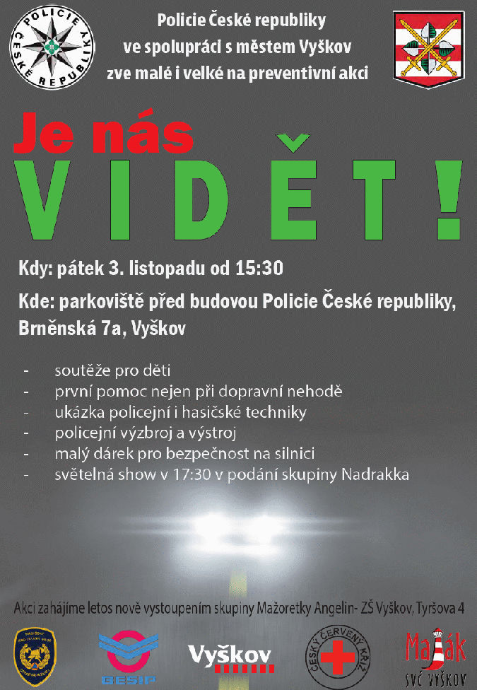 Obdobnou akci s názvem „Je nás vidět“ plánují také policisté na Vyškovsku, a to v pátek 3. listopadu od 15.30 hodin na parkovišti před budovou vyškovské policie. „I přesto, že působíme zejména preventivně, v případech, kdy zjistíme, že chodci nedodržují uvedené ustanovení a cyklisté nemají na jízdních kolech předepsané osvětlení, přistupují policisté k ukládání sankcí. Je nutné, aby si chodci i cyklisté uvědomili, že musí být v silničním provozu dobře vidět. Nejen mimo obec, jak ukládá zákon, ale i v obcích doporučujeme užívat reflexní prvky,“ uvedla policejní mluvčí Lenka Petrželková. Chodec, který je má na sobě, ať už ve formě oblečení, nebo doplňků jako jsou pásky, přívěsky, apod. je tak vidět až na 10 krát větší vzdálenost než v tmavém oblečení. Řidič pak dokáže včas zaznamenat chodce a díky tomu i bezpečně zareagovat. Chodci musí pamatovat na své zviditelnění s využitím reflexních prvků nejen za tmy, ale i za soumraku, svítání, při mlze či hustém dešti. Nejlépe je umístit prvky na pohyblivých částech těla. Dobré je třeba dát si reflexní pásku nad kotník a na ruku na straně přivrácené ke středu vozovky. „K závěru zbývá dodat, že by se měl každý, kdo se pohybuje v silničním provozu, zamyslet nad svojí bezpečnosti a udělat vždy maximum pro to, aby ochránil nejen svůj život, ale i životy a zdraví ostatních účastníků silničního provozu, k čemuž nám může dopomoci i zdánlivě obyčejná reflexní páska,“ doplnila Lenka Petrželková.