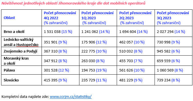 Čísla Centrály cestovního ruchu – Jižní Morava dokládají, že jižní Moravu vyhledává mimo Prahu dlouhodobě nejvíc turistů, zároveň tady ale tráví ze všech regionů nejkratší čas. „Rozhodli jsme se opět pohlédnout na návštěvnost optikou dat mobilních operátorů, která nabízejí trochu jiné souvislosti než běžné statistiky z hromadných ubytovacích zařízení. Můžeme podle nich například lépe zachytit zdrojové oblasti z tuzemska, odkud za námi na jižní Moravu lidé míří,“ uvedla ředitelka Centrály cestovního ruchu – Jižní Morava Martina Grůzová. Data mobilních operátorů dokážou vyčíslit skutečný podíl návštěvnosti v kraji. Ukazuje se, že v ubytovacích zařízeních je zachycena pouze čtvrtina návštěvníků regionu. Proč tomu tak je vysvětlil Martin Šauer z katedry regionální ekonomie Masarykovy univerzity, který se dlouhodobě zabývá problematikou dat mobilních operátorů: Vysílač vyhodnocuje, jak pravidelně a jak dlouho se uživatel pohybuje v lokalitě. Díky tomu mobilní data zachycují reálný pohyb uživatelů v síti a budou vždy vyšší, než statistiky v registrovaných ubytovacích zařízeních. Zachycují například i individuální ubytování, nekomerční zařízení nebo cesty spojené s chatami a chalupami. Díky těmto záznamům je možné lépe vyhodnotit celkový objem a strukturu poptávky po jižní Moravě. Algoritmus dokáže vyhodnotit pravidelné cesty do regionu a tyto osoby mezi návštěvníky nezařazuje.
