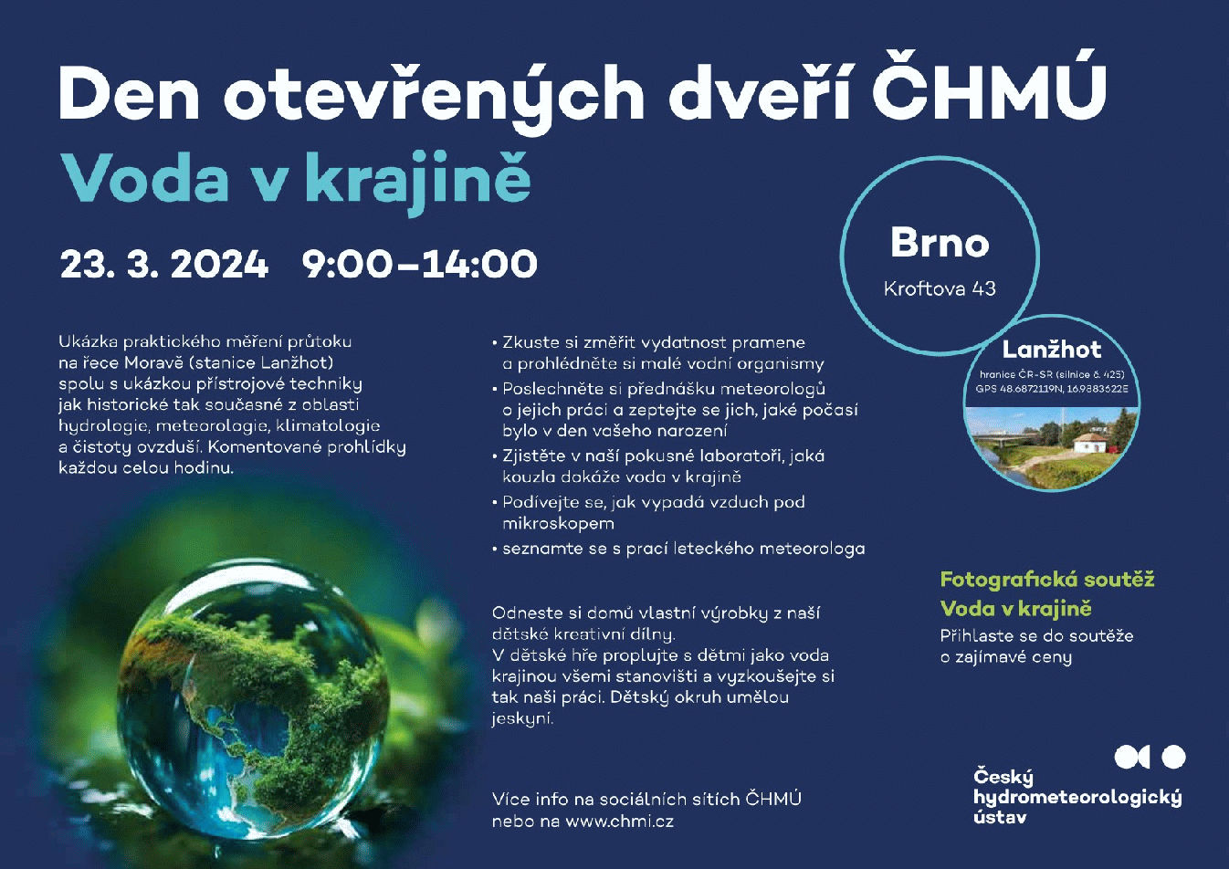 BRNO, BŘECLAV – Den otevřených dveří v Českém hydrometeorologickém ústavu ČHMÚ v Brně a Lanžhotě bude plný zážitků. Letošním tématem je „Voda v krajině“. Pro návštěvníky je přichystáno spoustu zajímavostí, doprovodných programů, praktických ukázek měření, ale i dalších atrakcí.