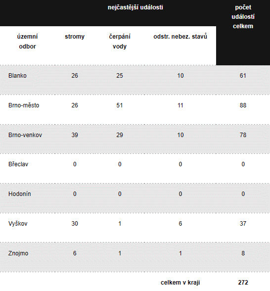 K první události vyjeli hasiči na Znojemsku pár minut po 7. hodině večer. Během dalších pěti hodin vyslali příslušníci operačního střediska jihomoravské profesionální a dobrovolné jednotky k dalším 227 událostem. U nejvíce událostí zasahovali hasiči na územních odborech Brno-město, Brno-venkov a Blansko. Nejčastěji odčerpávali vodu ze zatopených prostor a komunikací a dále odstraňovali popadané stromy. V Brně na ulici Purkyňova odčerpávalo pět jednotek čtyři hodiny vodu ze zatopených podzemních garáží. Nedaleko v ulici Hradecká hasiči řešili zaplavenou komunikaci.