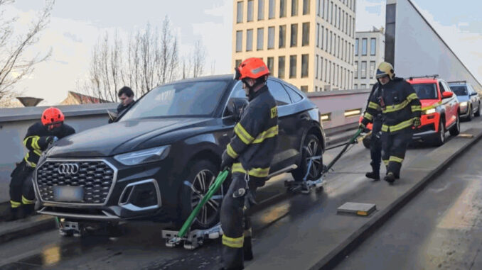 BRNO – V pondělí odpoledne hasiči na žádost policie pomáhali s transportem černého audi ze střešního parkoviště na ulici Trnitá v Brně.