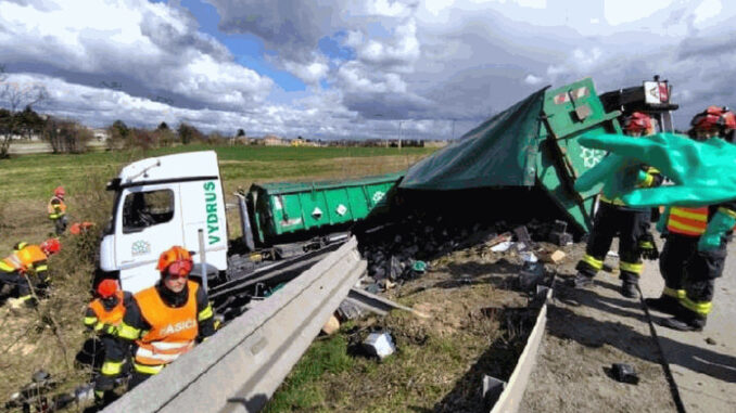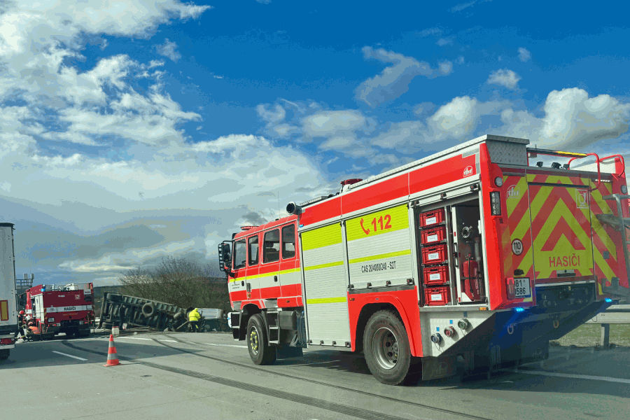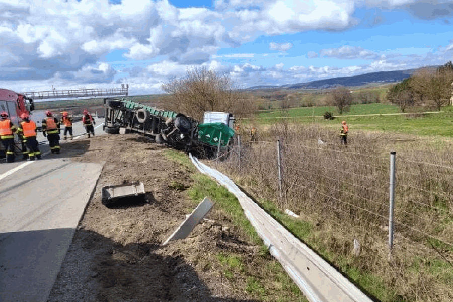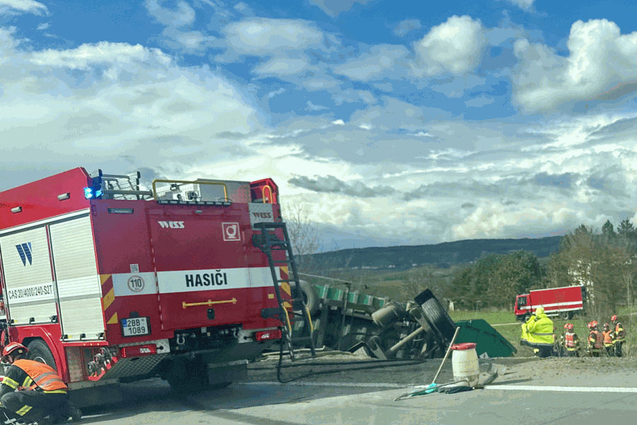 VYŠKOV – V pondělí v půl čtvrté odpoledne došlo na 215. kilometru dálnice D1 u Rousínova k vážné nehodě kamionu s nebezpečným nákladem baterií. Návěs kamionu se převrátil a náklad se vysypal.