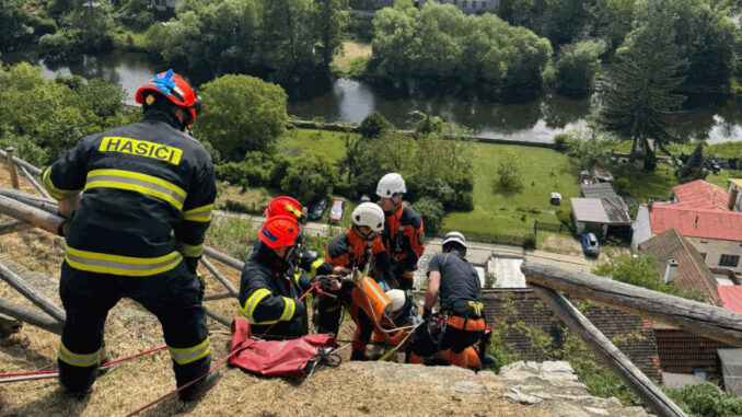 Žena středního věku padala několik metrů ze znojemských hradeb. O pomoc záchranáři požádali hasiče-lezce. Bylo nutné k ženě slanit a ve vakuové matraci ji následně na lanech vytáhnout nahoru. Jednalo se o středně těžká poranění. Pacientka byla zaléčena a zafixována, sanitkou převezena k heliportu znojemské nemocnice a poté vrtulníkem transportována k další péči do Fakultní nemocnice Brno. Děkujeme hasičům za výbornou spolupráci,” uvedla mluvčí záchranářů Michaela Bothová. Zasahovali hasiči ze Znojma a lezci ze stanice Brno-Lidická.