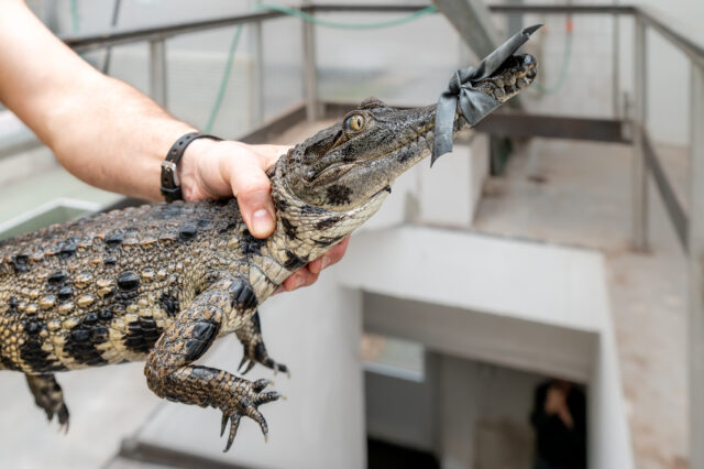 „Mláďata krokodýla štítnatého jsou plachá, proto jsme před část nádrže umístili mnoho rostlin, v jejichž krytu se cítí v bezpečí. Zvířata se ale ukázala jako velmi přizpůsobivá, dobře si zvykají a již je možné je velmi dobře pozorovat,“ popisuje zoolog Michal Podhrázský. „Zejména jedno ze zvířat, které již má zkušenost s pobytem v expozici, je zcela klidné. Současná situace, kdy je v safari parku menší množství návštěvníků, velmi nahrává plynulému zabydlení našich vzácných mláďat,“ doplňuje Michal Podhrázský.