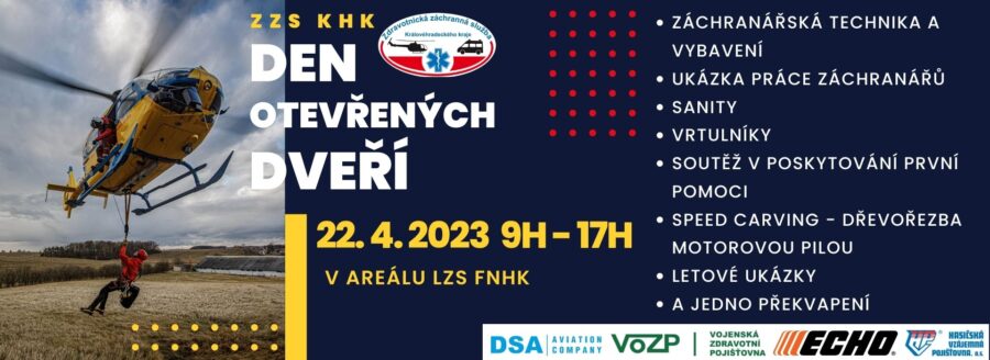 Akce se uskuteční v sobotu 22.4.2023 v čase od 9 do 17 hodin. „Pro návštěvníky máme připravenou také simulovanou dopravní nehodu s ukázkou správného postupu první pomoci a samozřejmě nebude chybět letová ukázka záchrany vrtulníkem LZS,“ láká k účasti mluvčí Zdravotnické záchranné služby Královéhradeckého kraje, Ivo Novák.