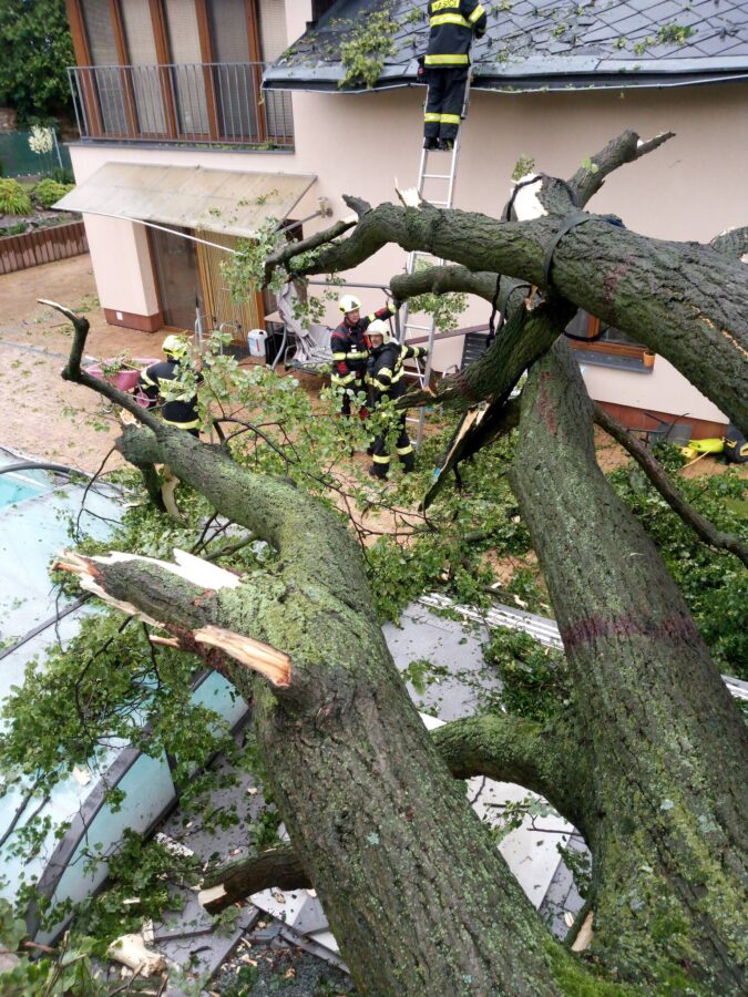 V Ještěticích spadla lípa na rodinný dům a poničila jeho střechu. Hasiči nejprve odřezali větve a poté s pomocí vyprošťovacího automobilu zajistili kmen stromu, aby ho mohli bezpečně odstranit.