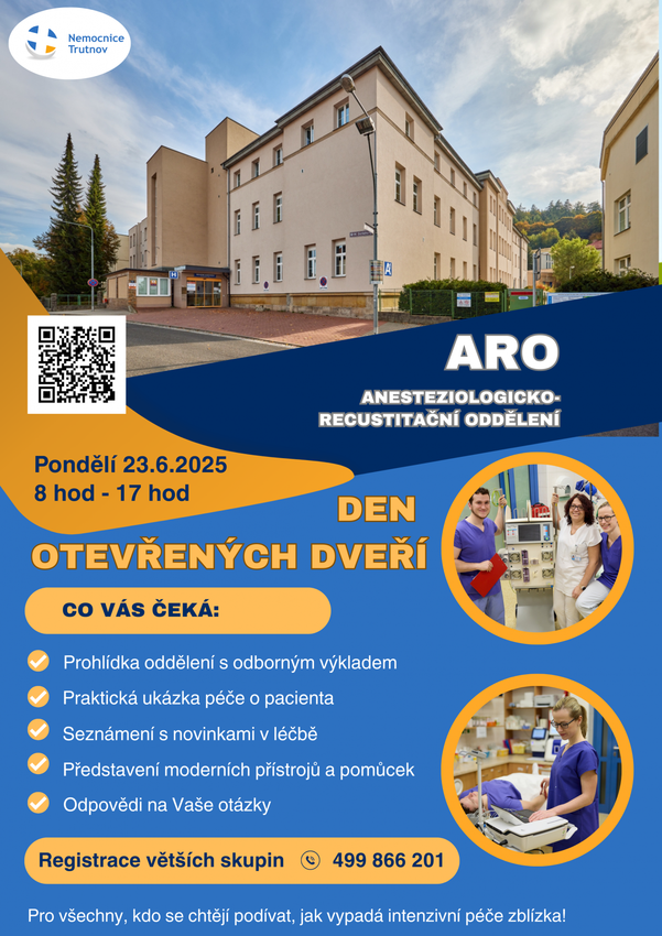 V pondělí 23. června 2025 od 8:00 do 17:00 hodin budete mít možnost projít si oddělení ARO v budově A Oblastní nemocnice Trutnov. Zdravotníci s bohatými zkušenostmi vám osobně představí své pracoviště a poodhalí, jak probíhá péče o pacienty v kritickém stavu, kteří potřebují tu nejintenzivnější podporu.