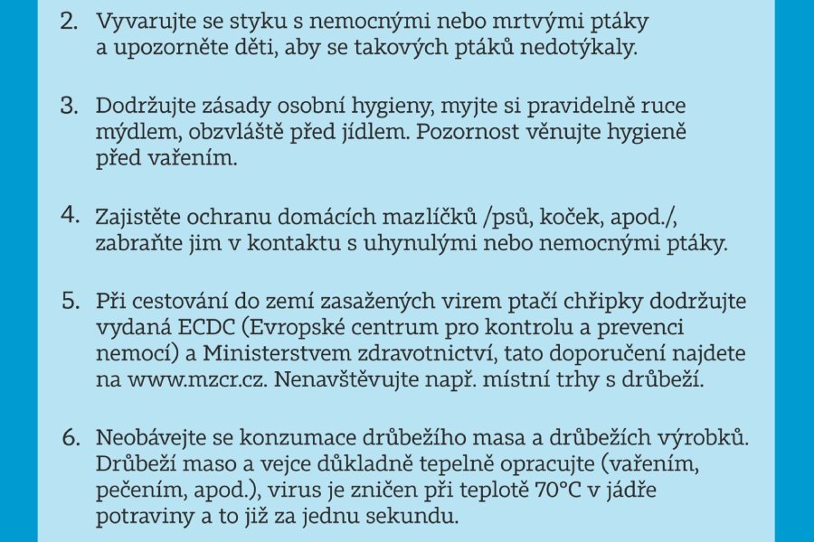 Státní veterinární správa dále chovatelům nařizuje používání dezinfekčních prostředků při vstupu do hospodářství a zvýšený dozor v chovu. „Město Frýdek-Místek žádá občany o zvýšenou opatrnost a dodržování hygienických opatření v této mimořádné situaci a také o všímavost i neprodlené hlášení případných nálezů uhynulých zvířat,“ sdělila mluvčí Frýdek – Místek Jana Musálková Jeckelová. V případě nálezu uhynulého zvířete je nutné kontaktovat Městskou policii Frýdek – Místek na telefonním čísle 156.