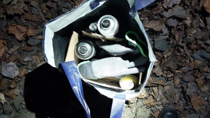 Netrvalo dlouho a čekalo je další překvapení! Dalším propátráváním místa narazili i na muže v černém oblečení, který se před nimi schovával. U něj pak nalezli tašku se šesti spreji a pracovními rukavicemi.
