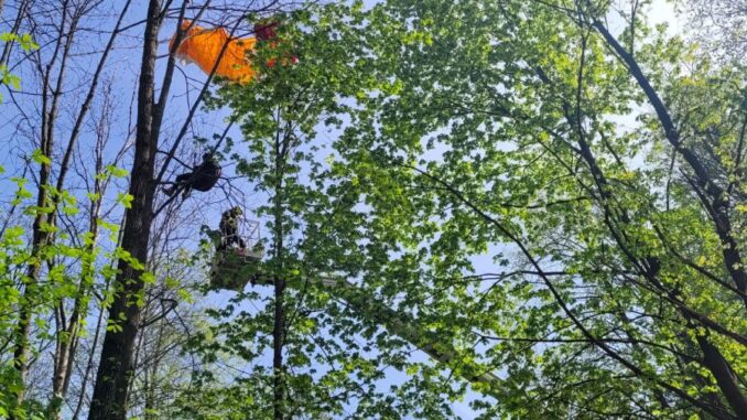 KOPŘIVNICE – Pomoc hasičů potřeboval paraglidista, který uvízl na stromě ve výšce patnácti metrů! Sundat jej museli za pomocí plošiny, naštěstí se mu nic nestalo.
