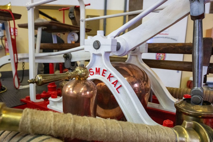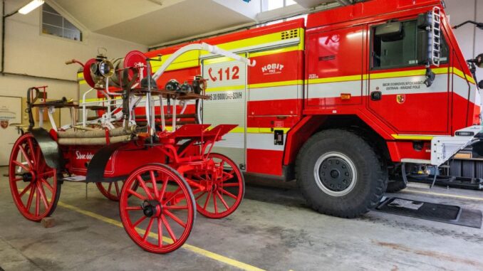 Zbrusu nové vozidlo krásnopolských hasičů vedle stříkačky jejich předchůdců z 19. století. Foto: Lukáš Kaboň