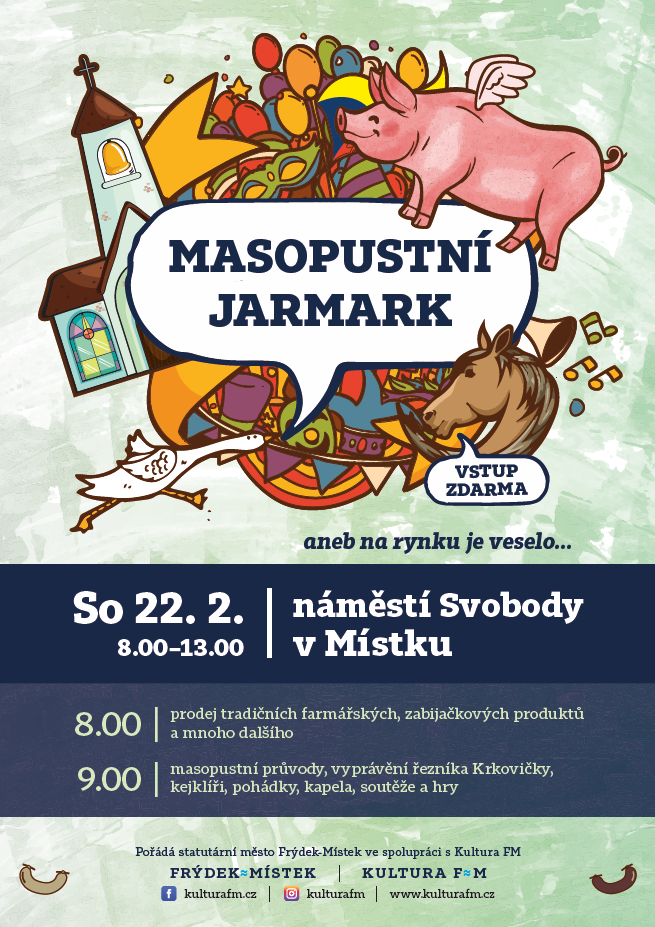 Masopust, obecně karneval je období veselení se, hodování a pití. Začíná svátkem Tří králů 6. ledna a pokračuje až do Popeleční středy, kterou začíná čtyřicetidenní půst před Velikonocemi. Akci MASOPUSTNÍ JARMARK aneb Na rynku je veselo pořádá statutární město Frýdek-Místek prostřednictvím Kultura FM.