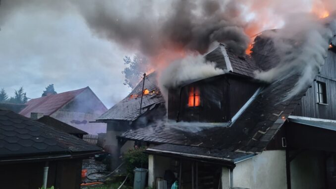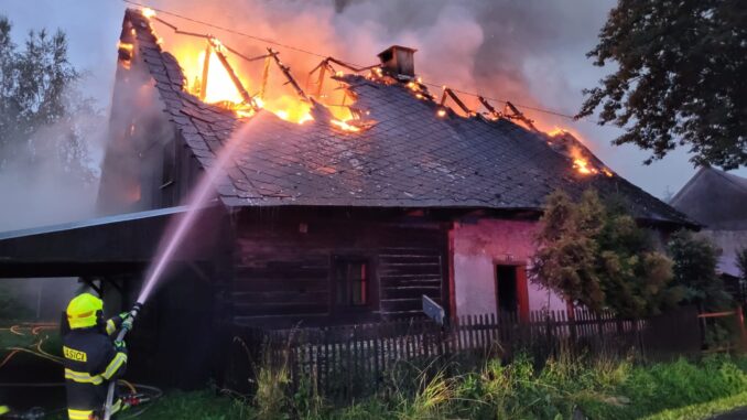 DĚTŘICHOV NAD BYSTŘICÍ – Poměrně rozsáhlý požár v Dětřichově nad Bystřicí zaměstnal osm jednotek hasičů. Nikdo se naštěstí nezranil. Hasiči z domu vynesli několik tlakových láhví.