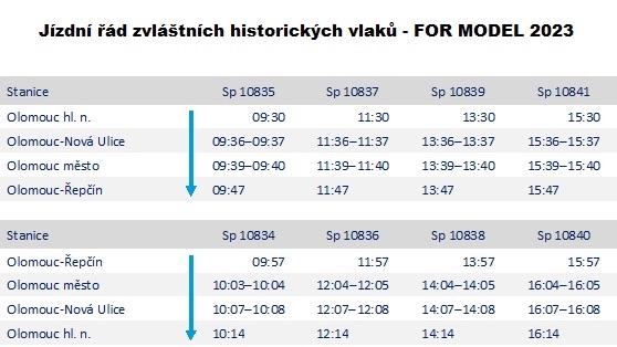 Poprvé u příležitosti konání výstavy For Model se lidé budou moci letos poprvé svézt historickými vlaky. Díky partnerství mezi Výstavištěm Flora Olomouc a Českými drahami vyjedou v sobotu 18. března mezi olomouckým hlavním nádražím a městskou částí Řepčín historické soupravy sestavené z legendárních motoráčků „Hurvínek“. Budou zastavovat i na zastávce Olomouc – město a zastávce Olomouc – Nová Ulice, kterou od interaktivní výstavy For Model dělí jen pár kroků. Jízdní řád historických vlaků přinášíme pod článkem. Za jednosměrné jízdné zaplatí dospělí od 15 let 70 korun a děti od 6 do 15 let 40 korun. Jízdenky bude prodávat personál vlaku před odjezdem. Kromě jízd zvláštních vlaků a samotné výstavy For Model 2023 bude pro milovníky železnice v sobotu otevřený také olomoucký depozitář ČD Muzea. A to od 9 do 12 a od 13 do 16 hodin. Vstupné činí 50 korun pro dospělé a 25 korun pro děti od 6 do 15 let, seniory od 65 let a držitele průkazů ZTP a ZTP/P.