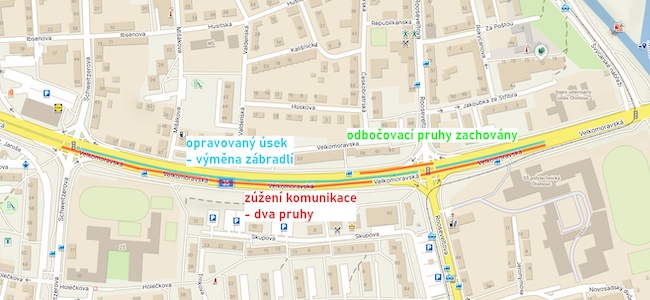 V pondělí 17. července začne na Velkomoravské ulici v Olomouci mezi křižovatkami se Schweitzerovou a s Rooseveltovou výměna stávajícího nevyhovujícího zábradlí ve středním dělícím pásu. Až do 28. srpna zde musejí řidiči počítat s dopravním omezením, místo však zůstane průjezdné. Silnice bude na více než 600 metrů dlouhém úseku zúžena do dvou pruhů. Odbočovací pruhy zůstanou zachovány.
