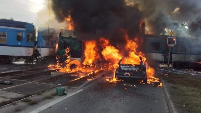 OLOMOUC – Dnes krátce před půl devátou ráno se na přejezdu na Bělidlech v Olomouci srazil vlak s kamionem. Po srážce vypukl požár, plameny zasáhly i osobní auto, které se zrovna nacházelo na místě nehody. Na místě zasahovali policisté, hasiči i záchranáři.