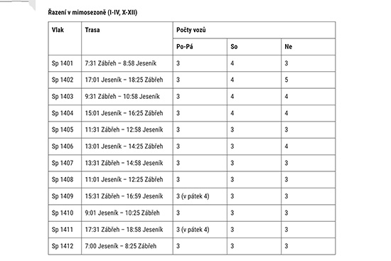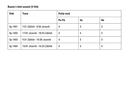 „Od prosince bude mít každá souprava spěšného vlaku nejméně tři vagóny, v některých případech rovnou pět. Posílení o jeden vůz navíc se bude týkat všech spěšných spojů na trati Zábřeh – Jeseník a zpět,“ vysvětlil Michal Zácha, náměstek hejtmana Olomouckého kraje pro oblast dopravy.