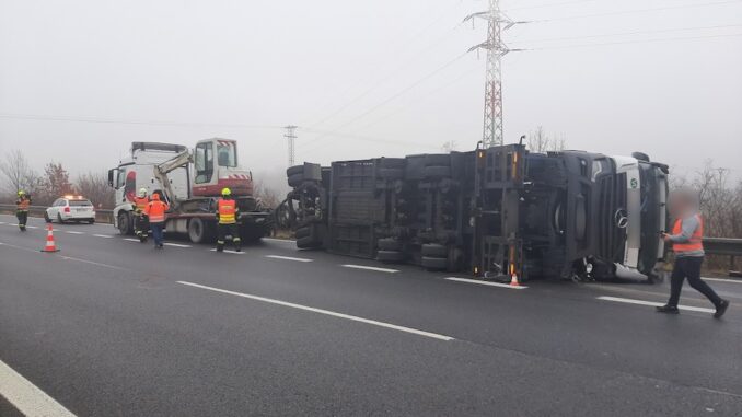 Nehoda se stala dnes po půl deváté na 272. kilometru dálnice D35 u Nemilan ve směru na Lipník nad Bečvou. „Devětatřicetiletý řidič nákladního vozidla nepřizpůsobil rychlost a za jízdy se mu převrátil přívěs, na kterém měl naložen tahač a osobní vozidlo,“ popsal nehodu policejní mluvčí Libor Hejtman. Při nehodě se nikdo nezranil, řidič nebyl pod vlivem alkoholu. Provoz byl v místě nehody ve směru na Ostravu asi tři hodiny sveden do levého jízdního pruhu.