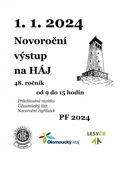 Tradiční novoroční výstup na Háj pořádá Klub českých turistů. Než se vydáte zdolat 134 schodů dřevěné rozhledny, musíte se dostat do nadmořské výšky 631 metrů. Kromě účastnického pamětního listu připravili pořadatelé pro příchozí i příležitostné razítko s novoroční vločkou. Zároveň budete moci přispět do sbírky Novoroční čtyřlístek, jejíž výtěžek jde na budování bezbariérových cest a vstupů do turistických objektů.