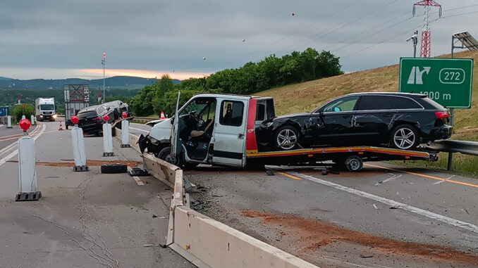 Nehoda se stala na 270. kilometru dálnice D35 ve směru na Ostravu. Sedmapadesátiletý řidič dodávky Iveco s přívěsem, převážející tři osobní auta, jel v levém jízdním pruhu a předjížděl kamion Mercedes. Přitom nezpomalil v místě zúžení jízdních pruhů a nerespektoval zákaz vjezdu vozidel nad vyznačenou šířku 2,2 metrů a pravou stranou narazil do levé přední části kamionu. „Řidič přestal mít nad vozidlem kontrolu a narazil do betonových středových svodidel a pravých ocelových svodidel. Následně došlo k odpojení přívěsu, který se zastavil na nízkých betonových svodidlech,“ popsal následky nehody policejní mluvčí Libor Hejtman. Dodávka zůstala stát přes oba jízdní pruhy. Při nehodě upadly části auta, do kterých narazil řidič Audi A6. Zraněn byl pouze řidič dodávky, který byl převezen do Fakultní nemocnice Olomouc. Žádný z řidičů nebyl pod vlivem alkoholu.