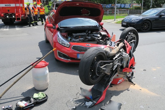 Nehoda se stala včera odpoledne na křižovatce ulic Jesenická x Uničovská x M. R. Štefánika v Šumperku. „Řidič vozidla Kia jel ve směru od Nového Malína a nerespektoval signál na semaforu červené barvy a vjel do křižovatky v době, kdy po ulici Jesenická, ve směru od Bludova, vjel do křižovatky na zelený signál 57letý řidič na motocyklu BMW,“ popsala nehodu policejní mluvčí Miluše Zajícová. Auto motorkáře srazilo, ten spadl na silnici a zranil se. Z místa byl převezen do Fakultní nemocnice Olomouc. Dechová zkouška u obou řidičů vyloučila vliv alkoholu. Policisté předběžně vyčíslili škodu na autě za 100 000 korun a na motorce za 150 000 korun. Nehodu dále šetří.