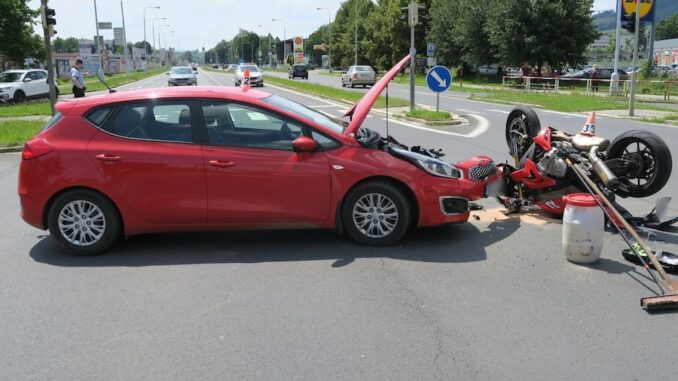 Nehoda se stala včera odpoledne na křižovatce ulic Jesenická x Uničovská x M. R. Štefánika v Šumperku. „Řidič vozidla Kia jel ve směru od Nového Malína a nerespektoval signál na semaforu červené barvy a vjel do křižovatky v době, kdy po ulici Jesenická, ve směru od Bludova, vjel do křižovatky na zelený signál 57letý řidič na motocyklu BMW,“ popsala nehodu policejní mluvčí Miluše Zajícová. Auto motorkáře srazilo, ten spadl na silnici a zranil se. Z místa byl převezen do Fakultní nemocnice Olomouc. Dechová zkouška u obou řidičů vyloučila vliv alkoholu. Policisté předběžně vyčíslili škodu na autě za 100 000 korun a na motorce za 150 000 korun. Nehodu dále šetří.