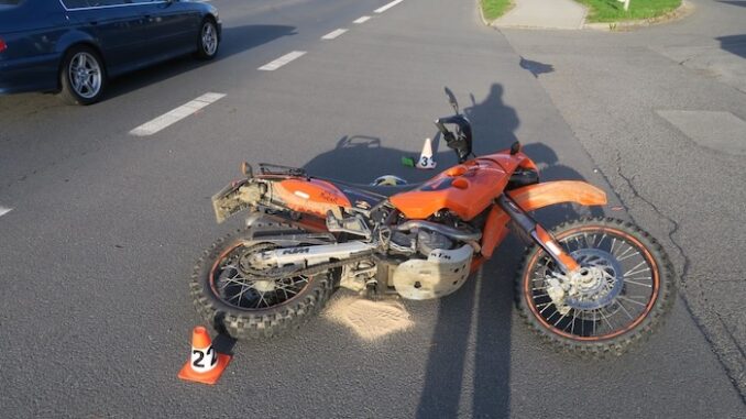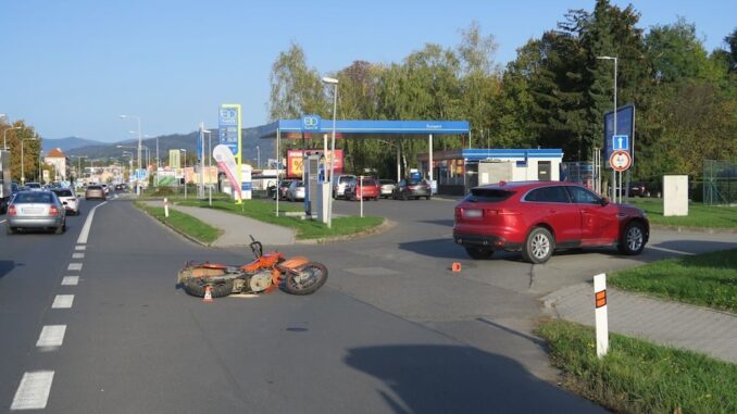 ŠUMPERK – V pátek odpoledne se slunce už sklánělo nad obzor a právě tehdy se stala nehoda v Šumperku. Řidiče v Jaguaru slunce prý oslnilo a on při odbočování vlevo na benzinku přehlédl motorku.