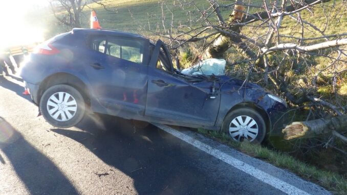Další nehoda se stala před 9. hodinou na silnici první třídy mezi Vlčicemi a Uhelnou. 68letý  řidič Renault podle policie nepřizpůsobil rychlost jízdy povětrnostním podmínkám. „Na zledovatělé vozovce dostal smyk, vjel do příkopu a narazil do stromu,“ dodala Skoupilová. Dechová zkouška vyloučila přítomnost alkoholu. Řidič byl na místě v péči zdravotníků. Hmotná škoda byla předběžně vyčíslena na 100 tisíc korun.