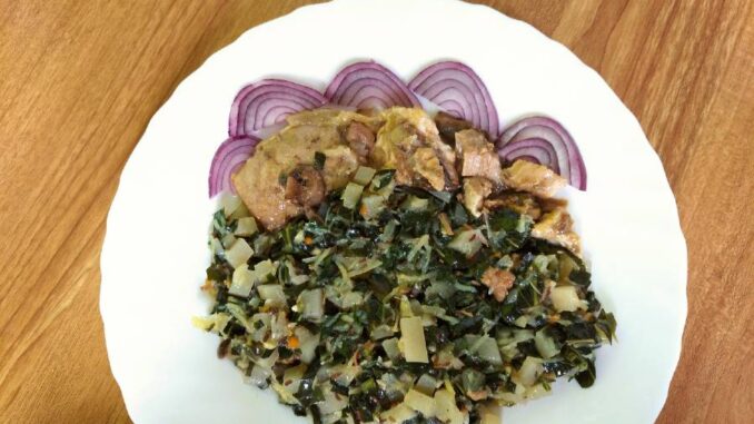Na oleji zpěníme do zlatova cibuli, a přidáme nakrájenou klobásku. Jakmile klobáska prolne s cibulí, vmícháme na kostičky nakrájené kedlubny. Po chvíli přisypeme kedlubnové listy nakrájené na tenké nudličky. Vše zamícháme, podlijeme vývarem a dusíme do změknutí. K zahuštění použijeme najemno nastrouhaný syrový brambor. (Pokud tento nestačí, můžeme klasicky zaprášit hladkou moukou.) Dle chuti okořeníme.