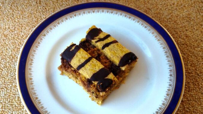 Větší díl vyváleného těsta přeneseme na plech nebo do kulaté formy vyložené pečicím papírem. Na něj umístíme náplň z jablek. Menší díl rozkrájíme na proužky, které umístíme jako ozdobnou mřížku na povrch koláče a dáme péci. Jakmile těsto chytne zlatavou barvu a odlepuje se od okrajů plechu, je čas vytáhnout koláč z trouby. Po vychladnutí můžeme mrkvovník ozdobit čokoládovou polevou.