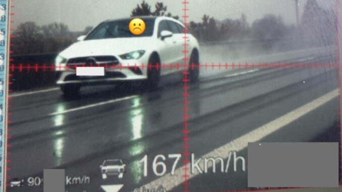 V neděli po půl druhé odpoledne zachytili dopravní policisté auto značky Mercedes, které v místě s povolenou rychlostí devadesát kilometrů za hodinu jede rychlostí sto šedesát sedm kilometrů za hodinu. „Policisté proto využili svého oprávnění vyplývajícího z novely zákona a muži na místě zadrželi řidičský průkaz. Ve správním řízení mu nyní hrozí pokuta až pětadvacet tisíc korun a zákaz řízení až na osmnáct měsíců,“ sdělila mluvčí policie Iveta Kopecká.