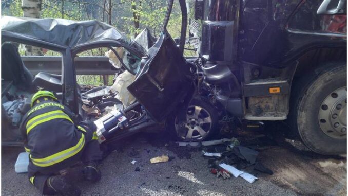 U těžké dopravní nehody zasahovaly tři jednotky hasičů, záchranáři, policie a přiletěl i vrtulník. Osobní auto bylo doslova zakousnuté pod náklaďákem. „Hasiči ze zcela zdemolovaného vozu museli vyprostit zaklíněnou spolujezdkyni i řidiče. Pomohli si navijákem, kterým napasovaný vůz dostali z pod nákladního automobilu. Hydraulické vyprošťovací zařízení jak profesionálních, tak dobrovolných hasičů bylo plně nasazeno,“ uvedla mluvčí hasičů Vendula Horáková.