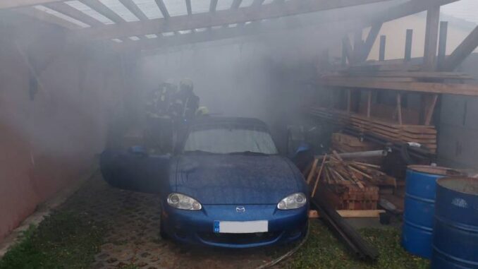 Pět hasičských jednotek likvidovalo požár přístřešku, kdy oheň poškodil auto, které v něm parkovalo. „Problém byla v přístřešku umístěná 10 kg propanbutanová lahev, kterou hasiči museli ochlazovat a zabránit explozi tlakové lahve.“ uvedla mluvčí hasičů Vendula Horáková. Vyšetřovatel hasičů po příjezdu na místo zjistil, že majitel v neděli vyhodil nevychladlý popel do plastové popelnice. Ten se vznítil a na majetku vznikla škoda ve výši sto padesát tisíc korun. Uchránit se podařilo majetek ve výši dva a půl milionu korun.