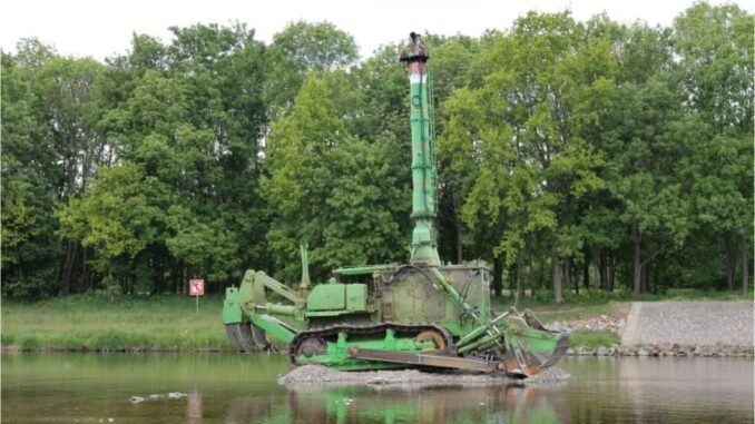 Nasazený speciální dálkově ovládaný podvodní buldozer je obojživelný kolos, který přesahuje hmotnost čtyřiceti tun. „Tento stroj dokáže pracovat až sedm metrů pod hladinou a jeho úkolem je odstraňovat nánosy štěrku a kamení, které se zde usadily po povodních,“ uvedl mluvčí města Pardubice Daniel Vodák. Stroj je vybaven komínem, který je vysoký sedm metrů.