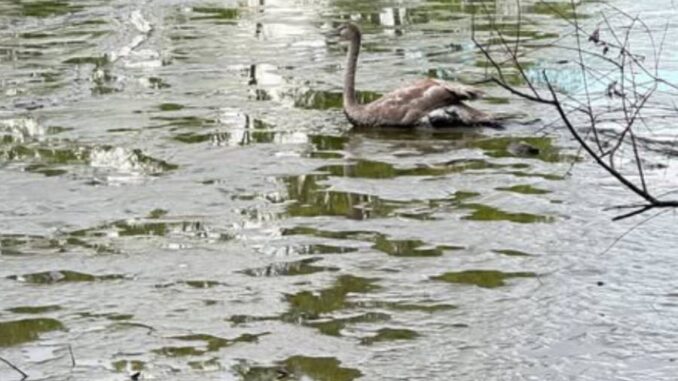 PŘELOUČ – Čtveřice labutích mláďat uvízla v pondělí odpoledne v obci Poběžovice v bahně vypuštěného rybníka. Na místo přijel i pracovník Záchranné stanice Pasíčka.