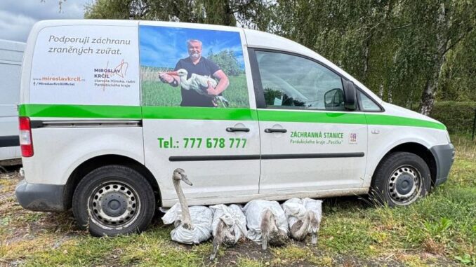 Žena, která se procházela kolem rybníka v Poběžovicích si všimla labutí, které uvízly v bahně a neměly možnost se sami z bahna rybníka dostat. Nahlásila celou událost hasičům. Po příjezdu pracovníka Záchranné stanice Pasíčka, který vyhodnotil situaci, požádal o asistenci hasiče. „Společně se nám podařilo všechna čtyři mláďata bezpečně odchytit. Následně byla labutí mláďata předána do péče záchranné stanice, kde budou očištěna a poskytnuta jim potřebná péče do doby, než budou schopna samostatného letu a návratu do přírody,“ objasnil velitel zásahu ze stanice Přelouč Ladislav Dufek.