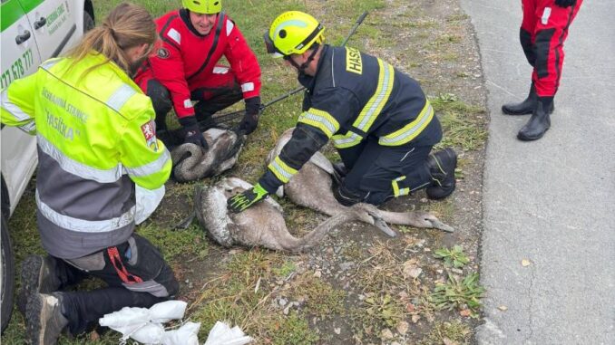 Zásah proběhl bez komplikací díky výborné spolupráci hasičů a pracovníků záchranné stanice. „Bahnem nacucané labutě neměly na vypuštěné vodní ploše dobré vyhlídky. Po odchytu jsme jim očistili zobáky a peří, nyní jsou v bezpečí a v dobrých rukou,“ řekl Milan Oppa ze stanice Pasíčka.