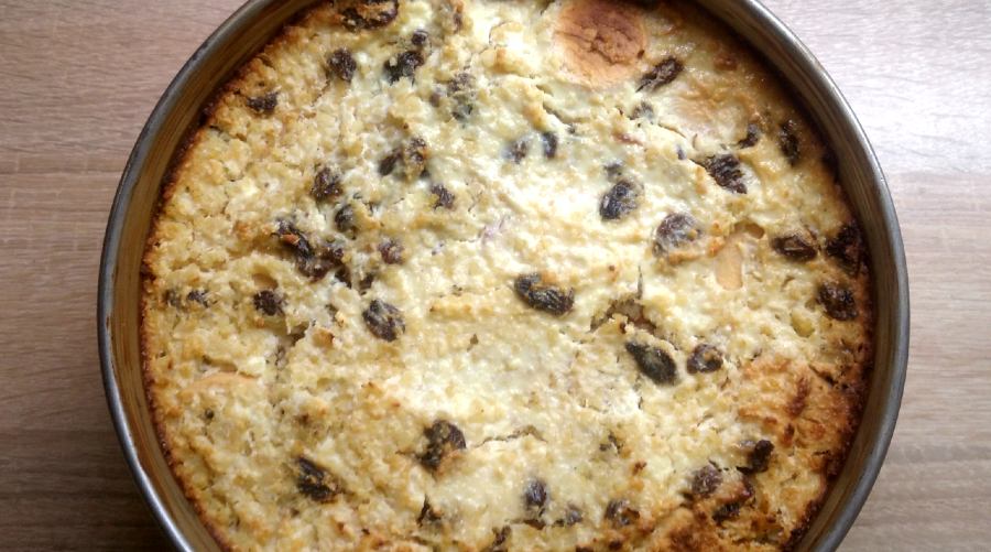 Na jablka naneste tvarohovou nádivku. Ta vznikne tak, že kostku tvarohu podle potřeby smícháte s trochou mléka, přidáte cukr, opláchnuté rozinky a šťávu z citronu. Na tvaroh nanesete zbytek jahel a trochu je vtlačte do tvarohové vrstvy. Pečte při 180 °C přibližně 35 až 45 minut. Nákyp se krájí nejlépe až za studena. Řez nákypu lze podávat také jako snídani, svačinu či večeři. Před ohřevem v mikrovlnné troubě můžete poklást kousky čokolády, které roztopené výborně chutnají.