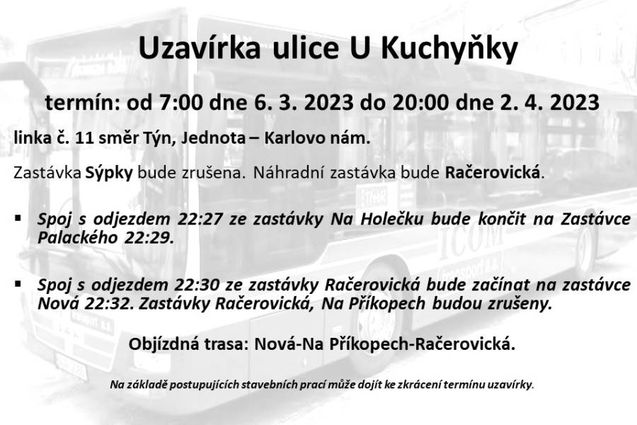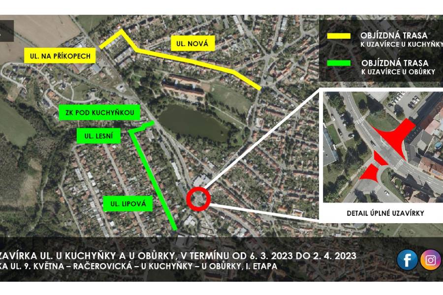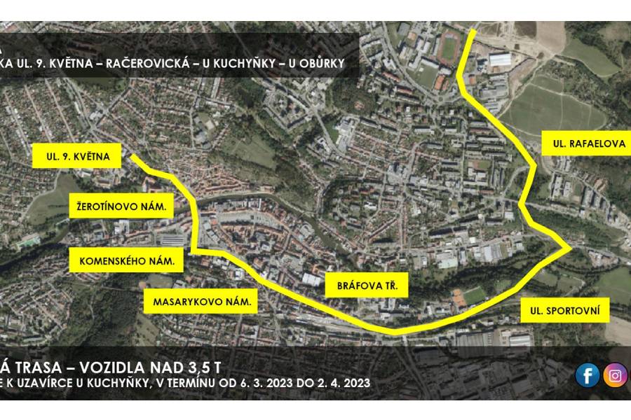 Objízdná trasa uzavírky v ulici U Kuchyňky povede pro vozidla do 3,5 tuny obousměrně ulicemi Na Příkopech, Nová a U Kuchyňky. Vozidla nad 3,5 tuny pojedou po silnici č. II/351 (9. května, Žerotínovo náměstí, Komenského náměstí) a poté po silnici I/34 (Komenského náměstí, Masarykovo námětí, Bráfova ulice, Sportovní ulice) a po ulici Rafaelova.