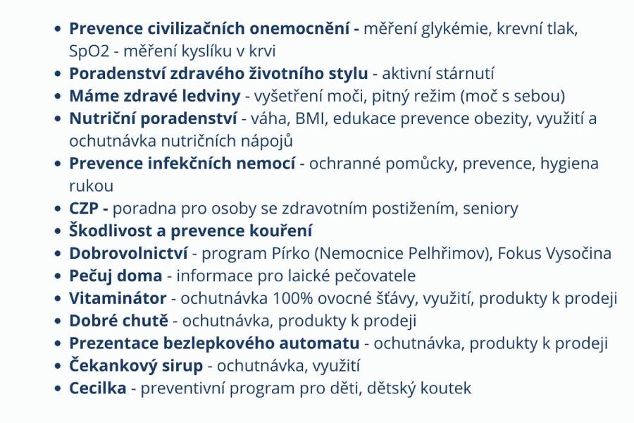 Den pro zdraví se koná ve čtvrtek 13. dubna od 10.00 do 14:00 hodin v Atriu hlavní lůžkové budovy Nemocnice Pelhřimov. Akce je určena široké veřejnosti. „Návštěvníci se mohou těšit na bohatý program od měření glykémie, krevního tlaku, množství kyslíku v krvi až po vyšetření moči. Chybět nebude prevence infekčních onemocnění a nutriční poradenství,“ sdělila mluvčí pelhřimovské nemocnice Alexandra Knapová.