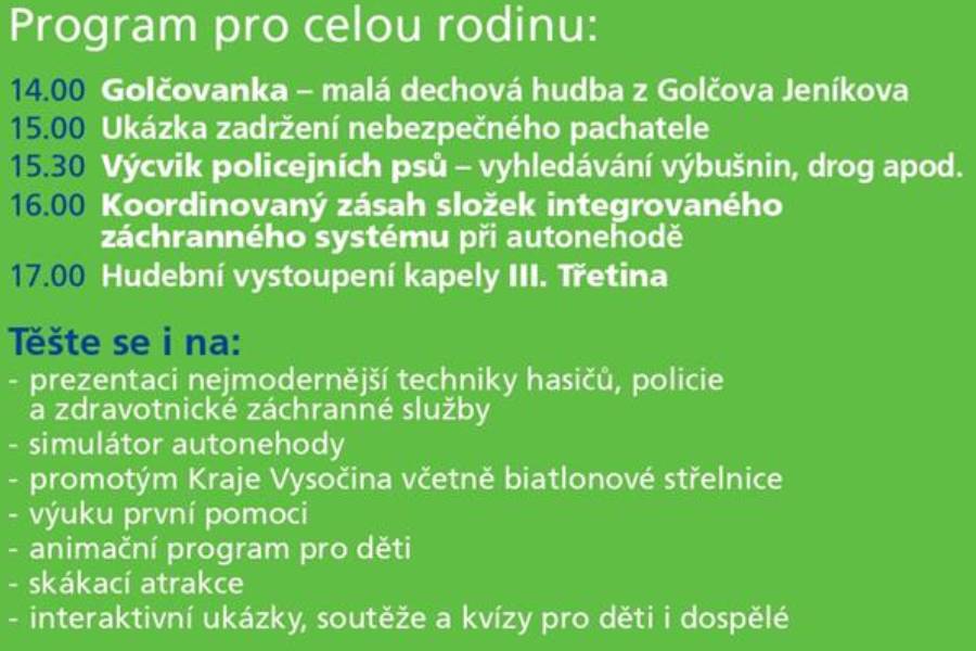 Akce Den s Krajem Vysočina proběhne v sobotu 17. června v době od 14 do 18 hodin v Jihlavě. Veřejnost zde bude mít jedinečnou možnost poznat zblízka práci i nejmodernější techniku policejních složek, hasičů a zdravotnické záchranné služby.