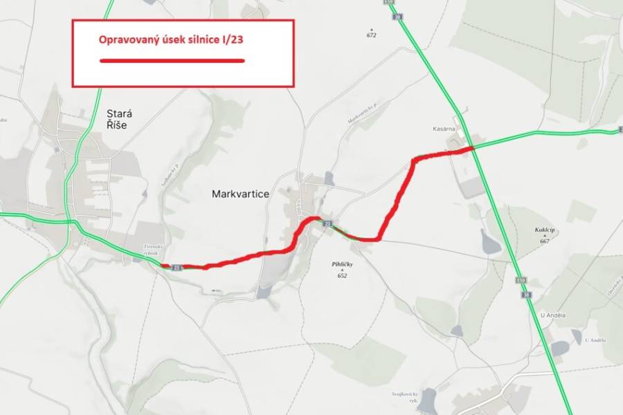 Konkrétně půjde o část od mostu na Sedlatickém potoce u Staré Říše až po okružní křižovatku silnic I/23 a I/38 u osady Kasárna. „Povrch vozovky vykazuje značné opotřebení, je v něm velké množství trhlin, které místy přechází do hloubkové koroze. Diagnostický průzkum prokázal, že lokálně se pod silnicí nacházejí i skryté výdutě. V celém úseku je možné spatřit olámané krajnice, výtluky i velké množství vysprávek různého stáří a charakteru,“ popsal mluvčí ŘSD ČR Martin Buček.