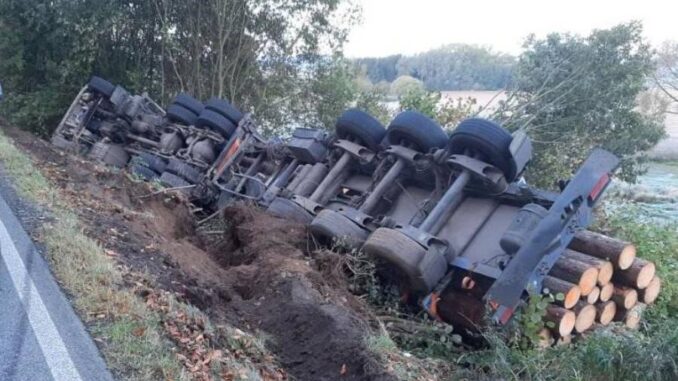 JIHLAVA – U obce Nevcehle došlo v úterý ráno k nehodě kamionu převážejícího dřevní kulatinu. Řidič najel na krajnici a soupravu převrátil. Při nehodě se zranil.